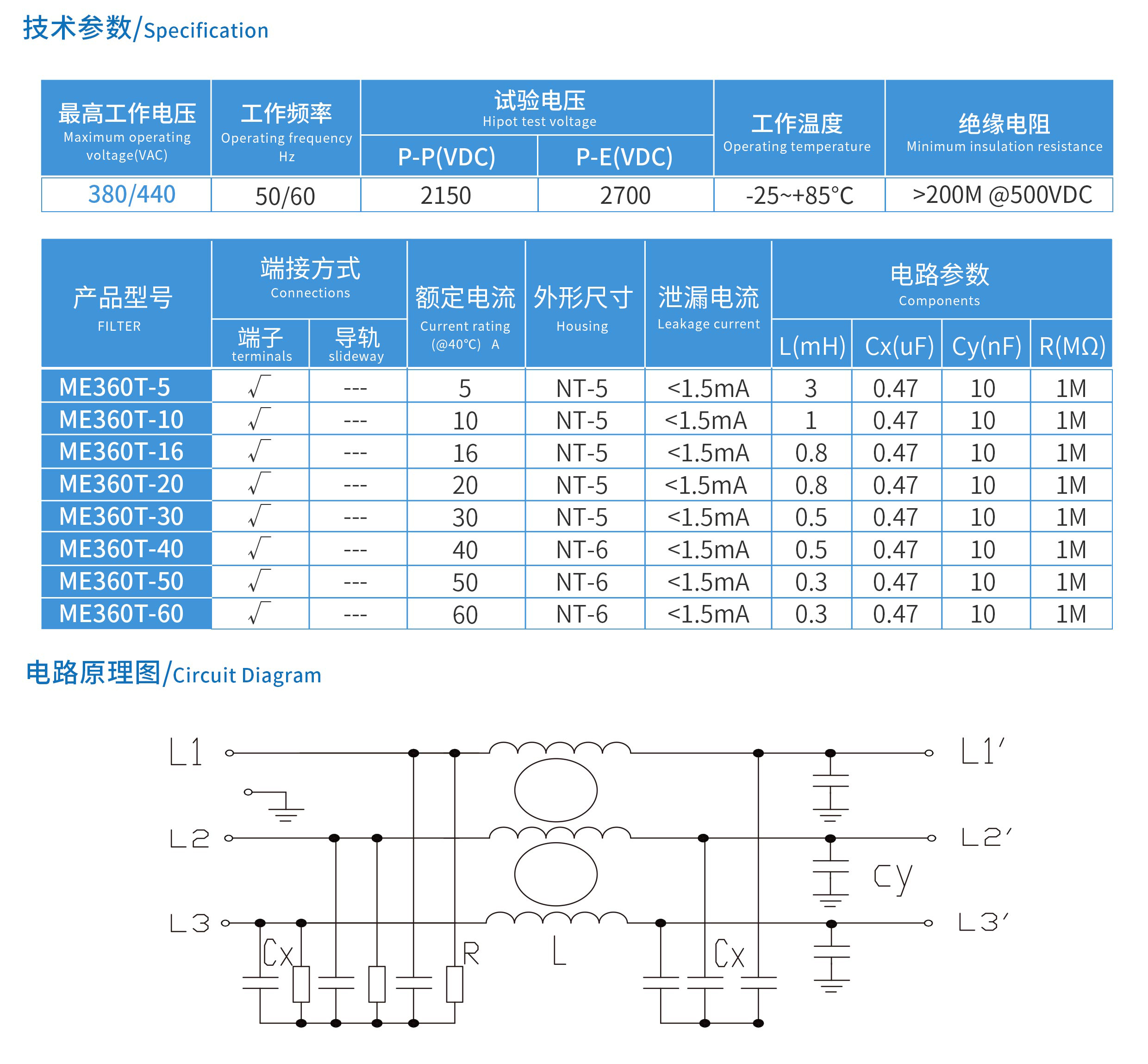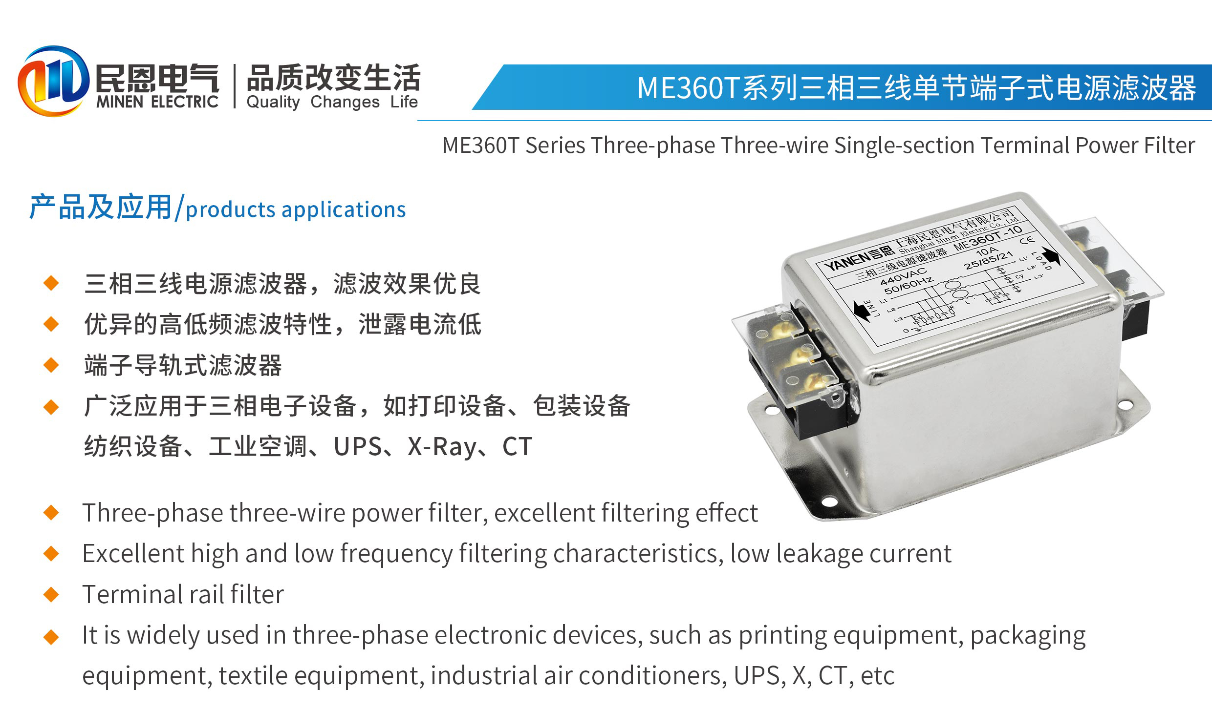 三相三線電源濾波器,濾波效果優良,優異的高低頻濾波特性,泄露電流低,端子導軌式濾波器
