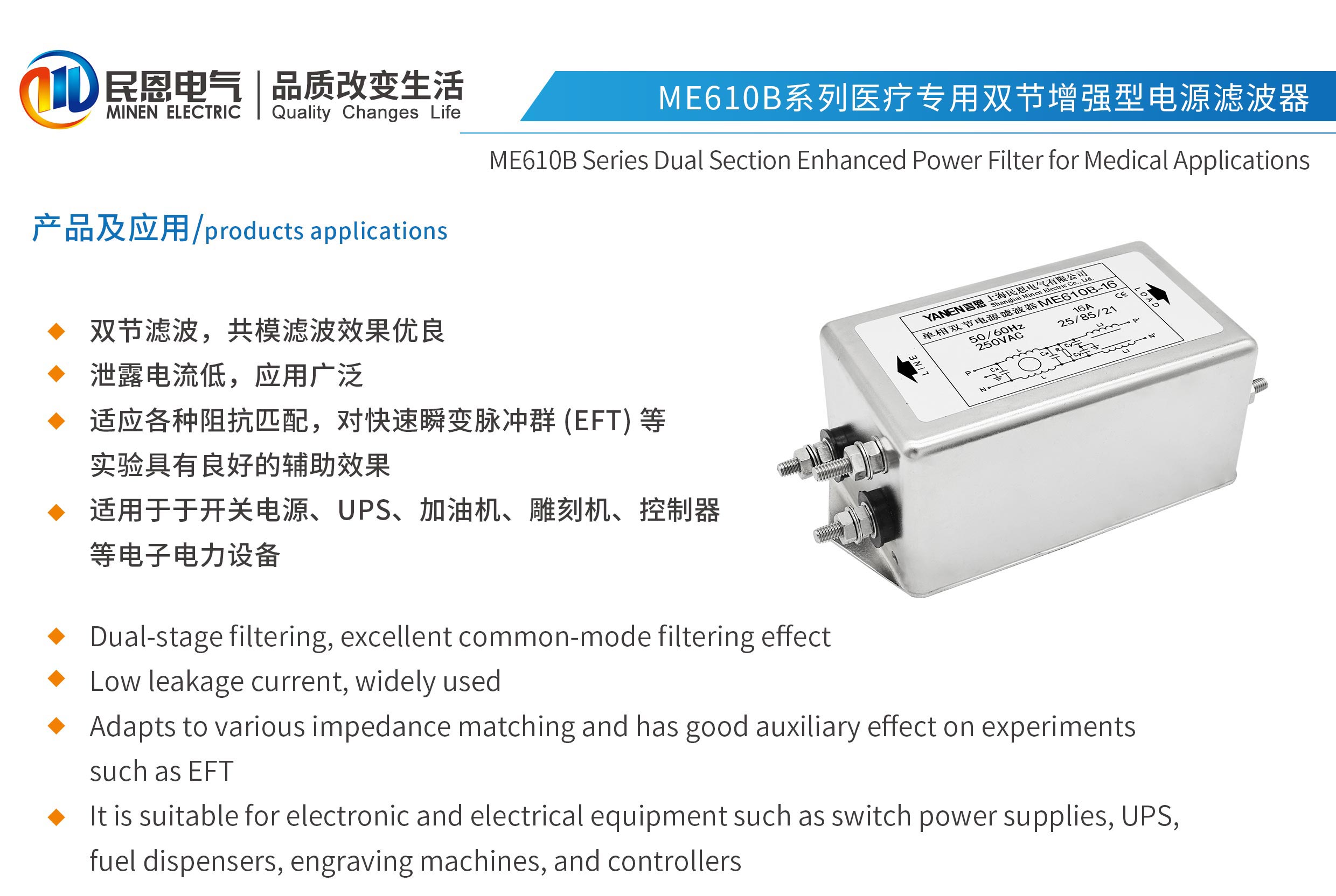 ME610B系列醫療專用雙節增強型電源濾波器