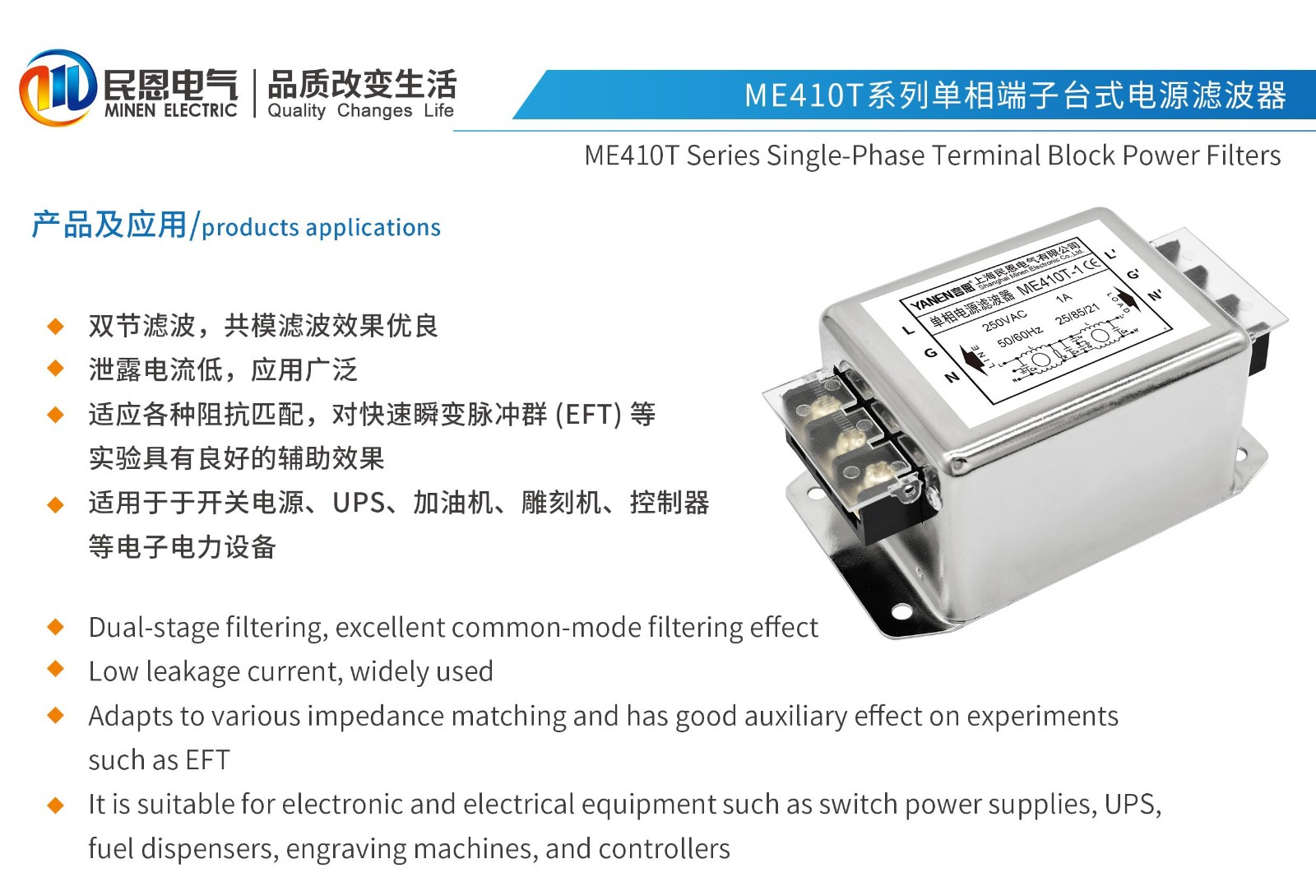 ME410T系列單相端子臺(tái)式電源濾波器